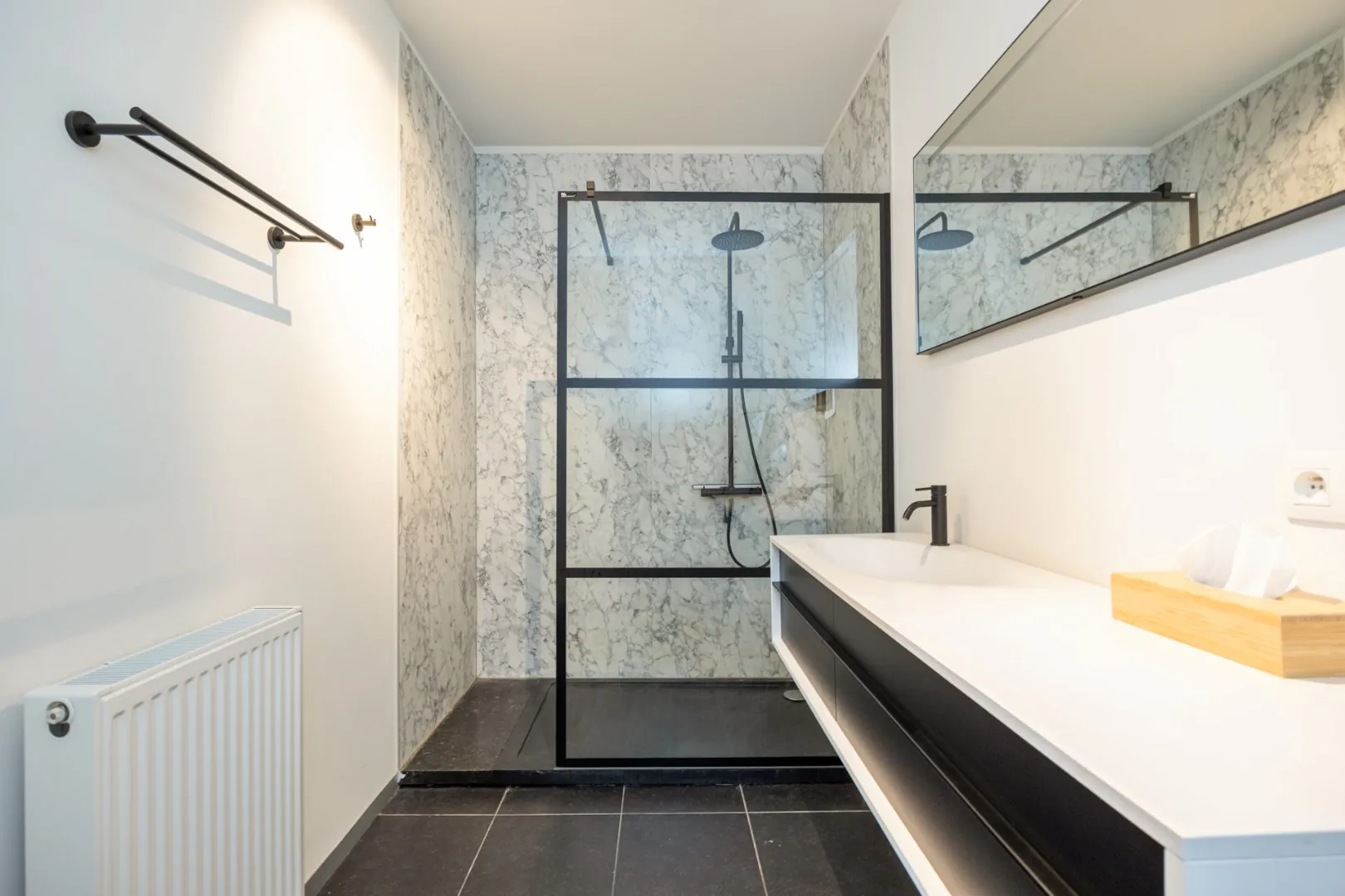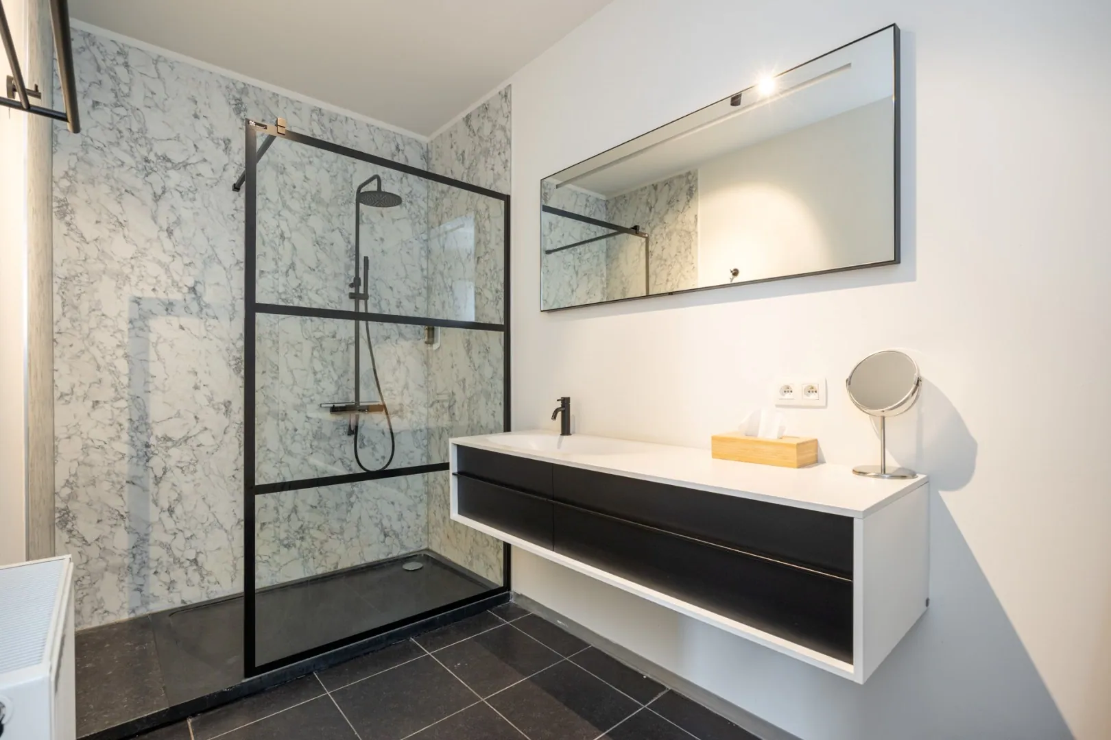 Via de hal bereikt men een eerste slaapkamer (13m2), een tweede slaapkamer (8m2) en een badkamer voorzien van een ruime moderne inloopdouche met regendouchekop en een dubbele lavabo, een apart toilet en een berging voorzien van aansluitingen voor wasmachine en droogkast.