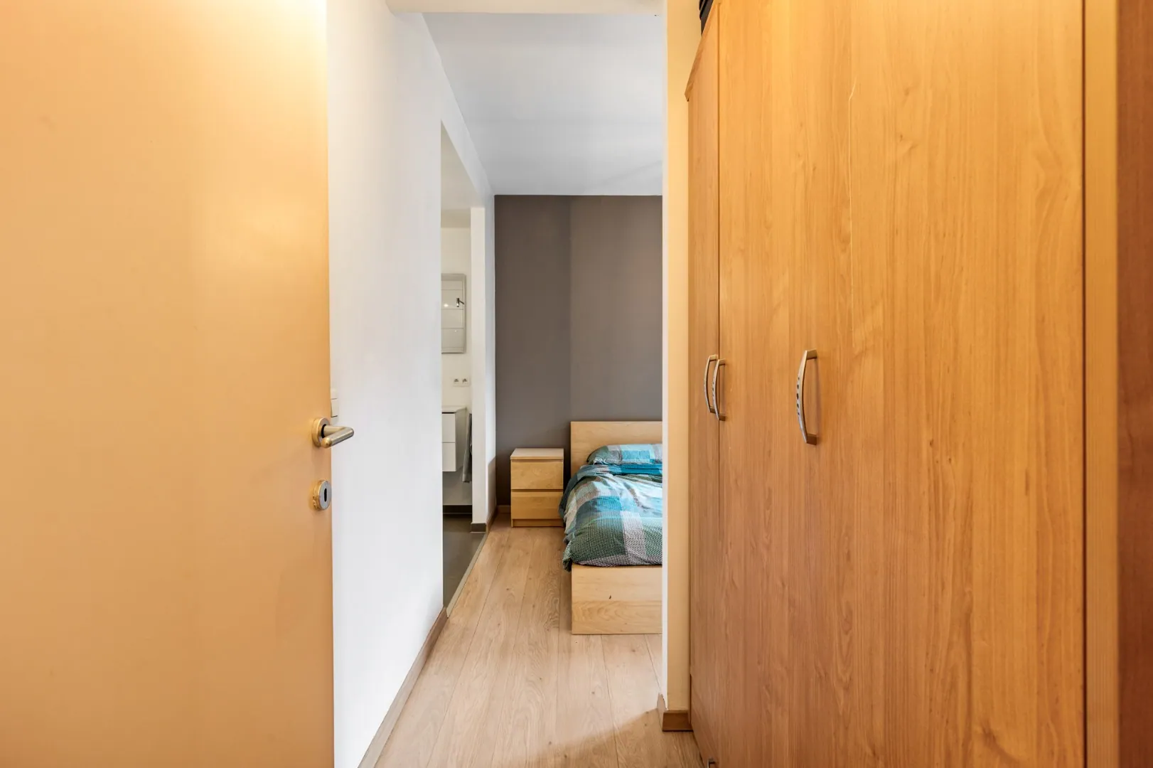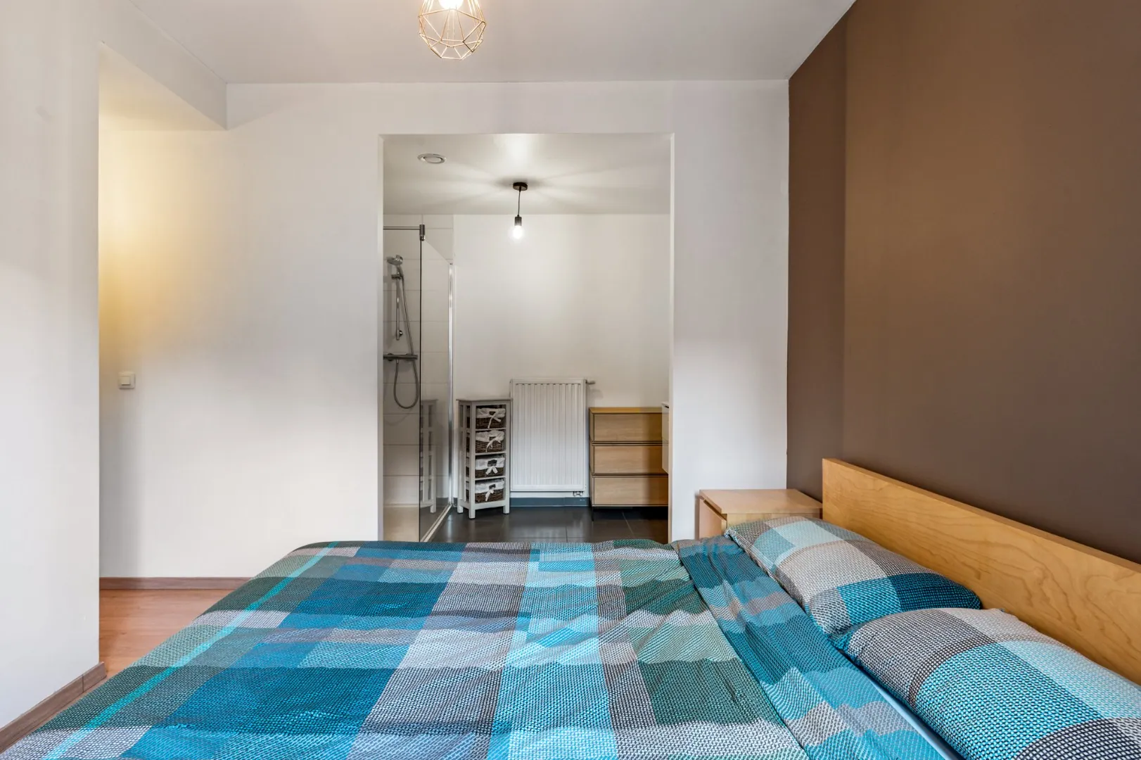 Via de hal heeft men toegang tot een ruime slaapkamer (11m2) voorzien van een ensuite badkamer uitgerust met een douche en lavabo.