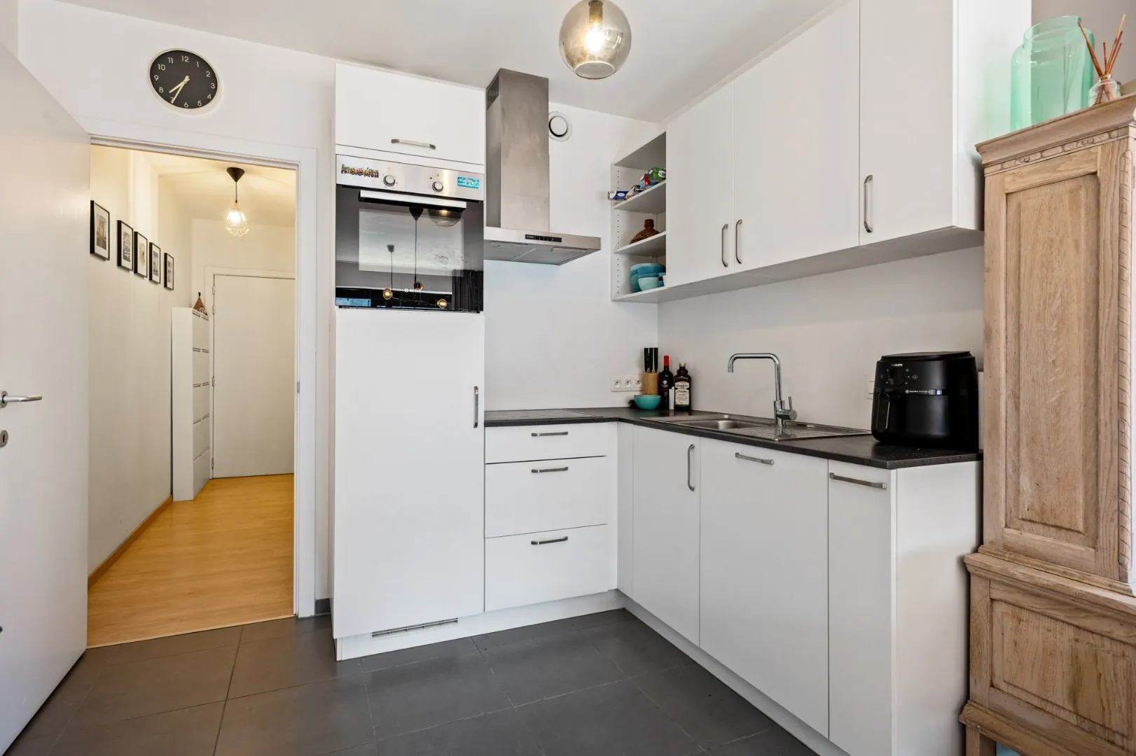 Het appartement gelegen op de tweede verdieping, bereikbaar met de lift, heeft volgende indeling: via de inkomhal betreedt men de lichtrijke leefruimte met een geïnstalleerde open keuken voorzien van toestellen.