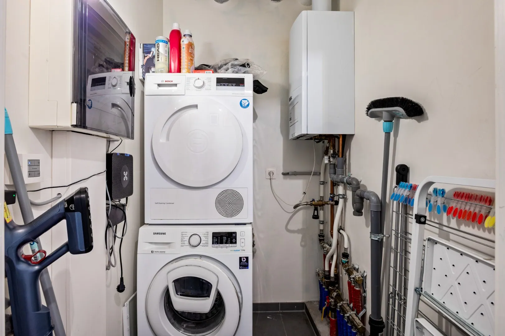 Verder op de hal nog een apart toilet en een berging met aansluitingen voor wasmachine en droogkast.