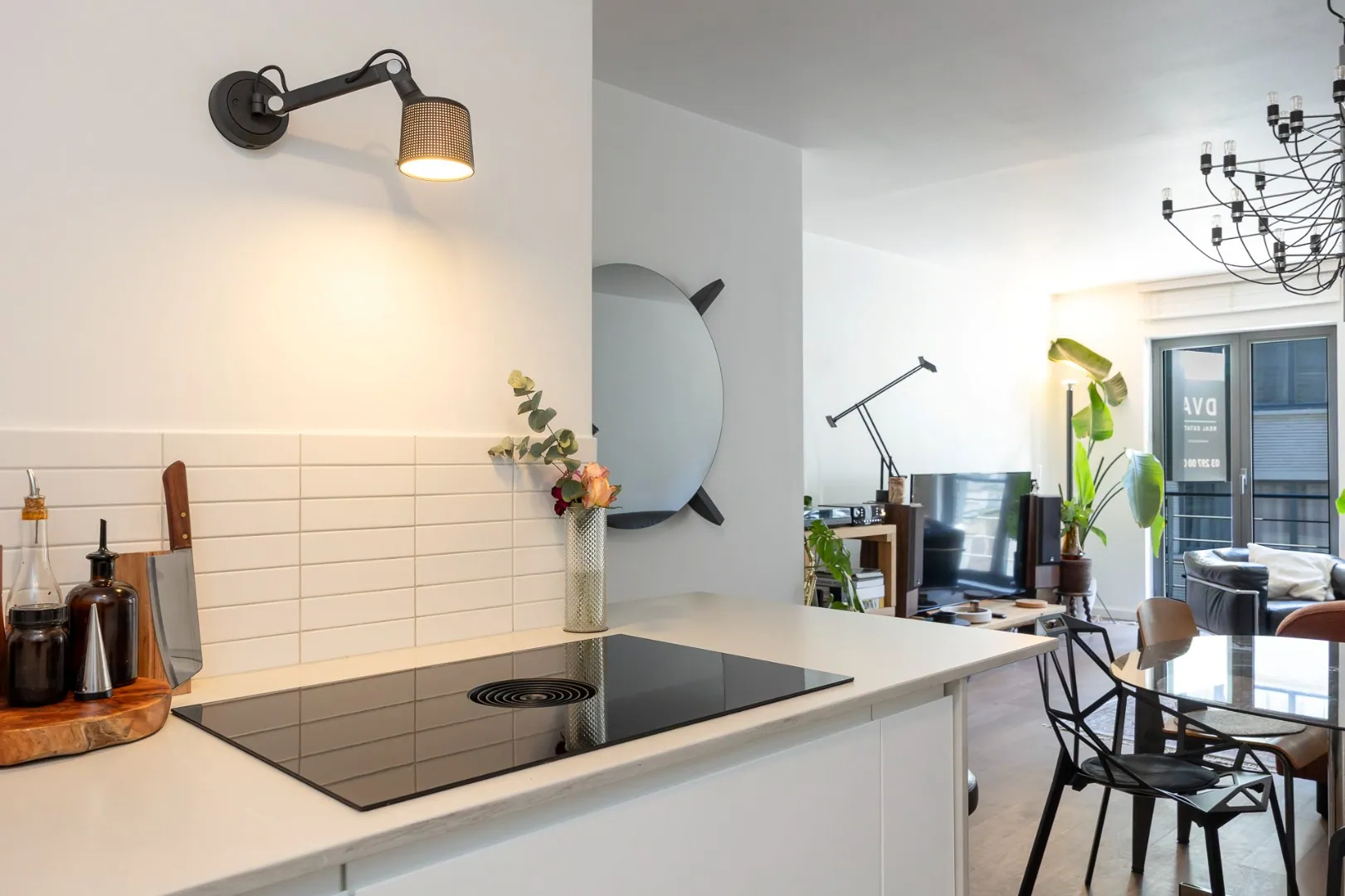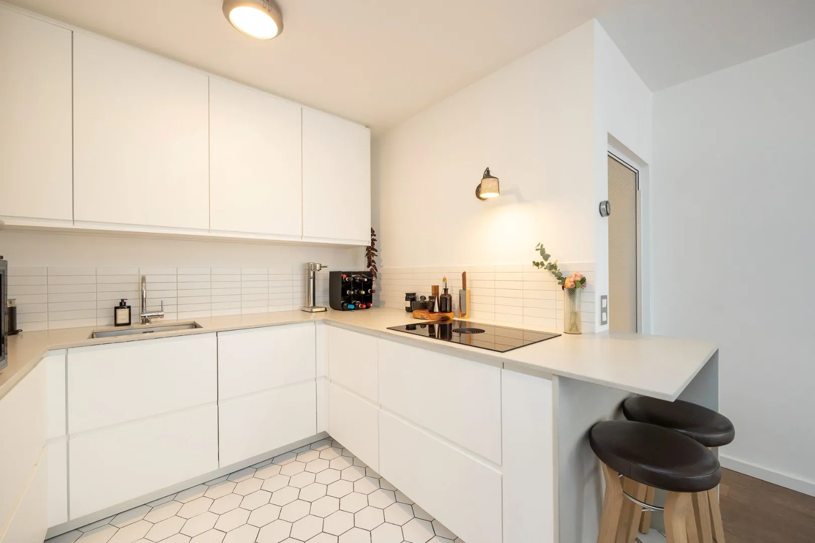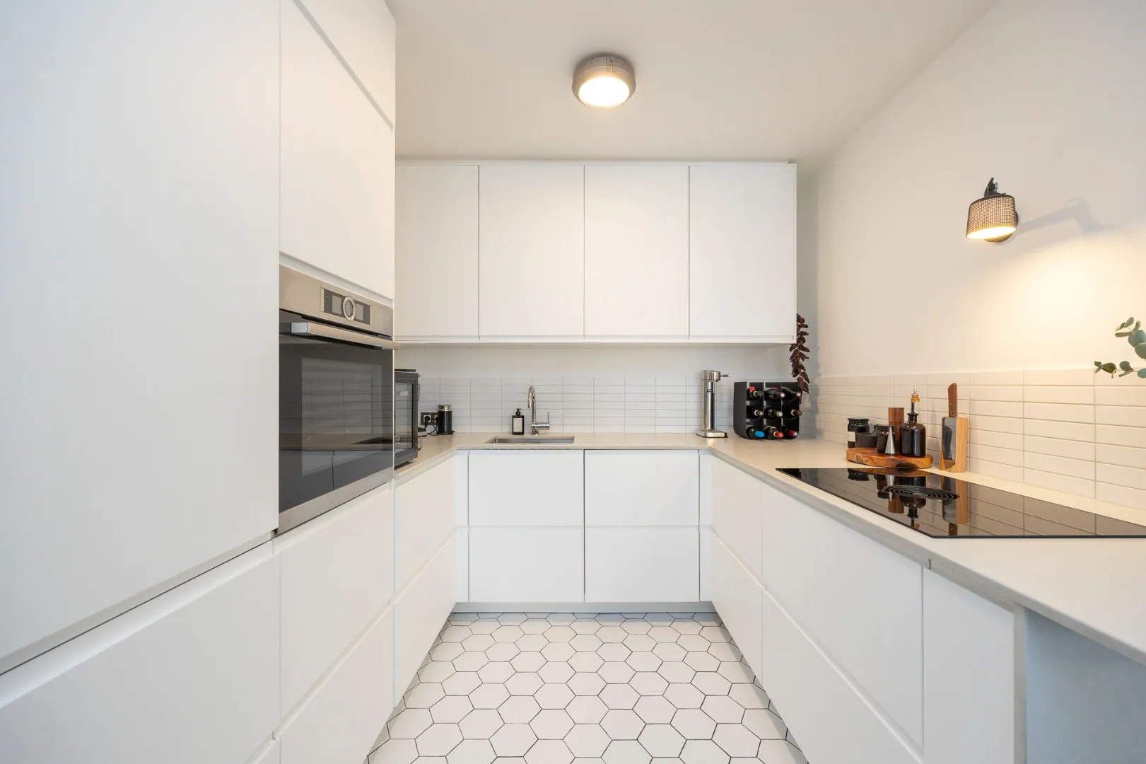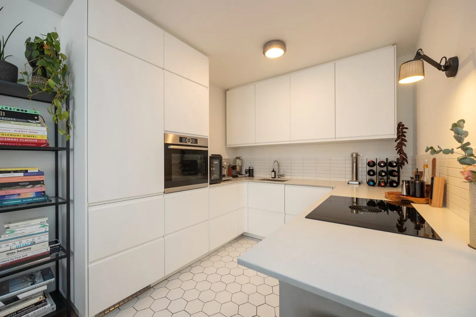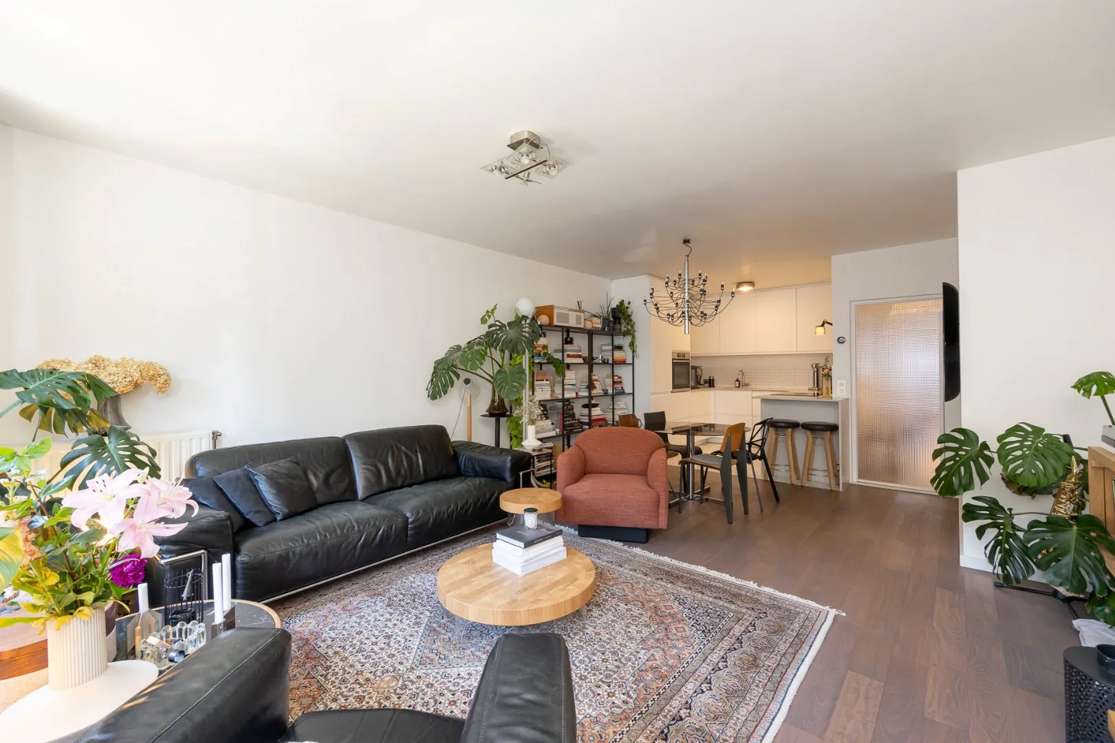 Via de inkomhal betreedt men de lichtrijke leefruimte met een volledig geïnstalleerde open keuken voorzien van een BORA inductie kookplaat met afzuiging, een Bosch combi-stoomoven, een XXL AEG vaatwasser en een SileStone kwartscomposiet werkblad.