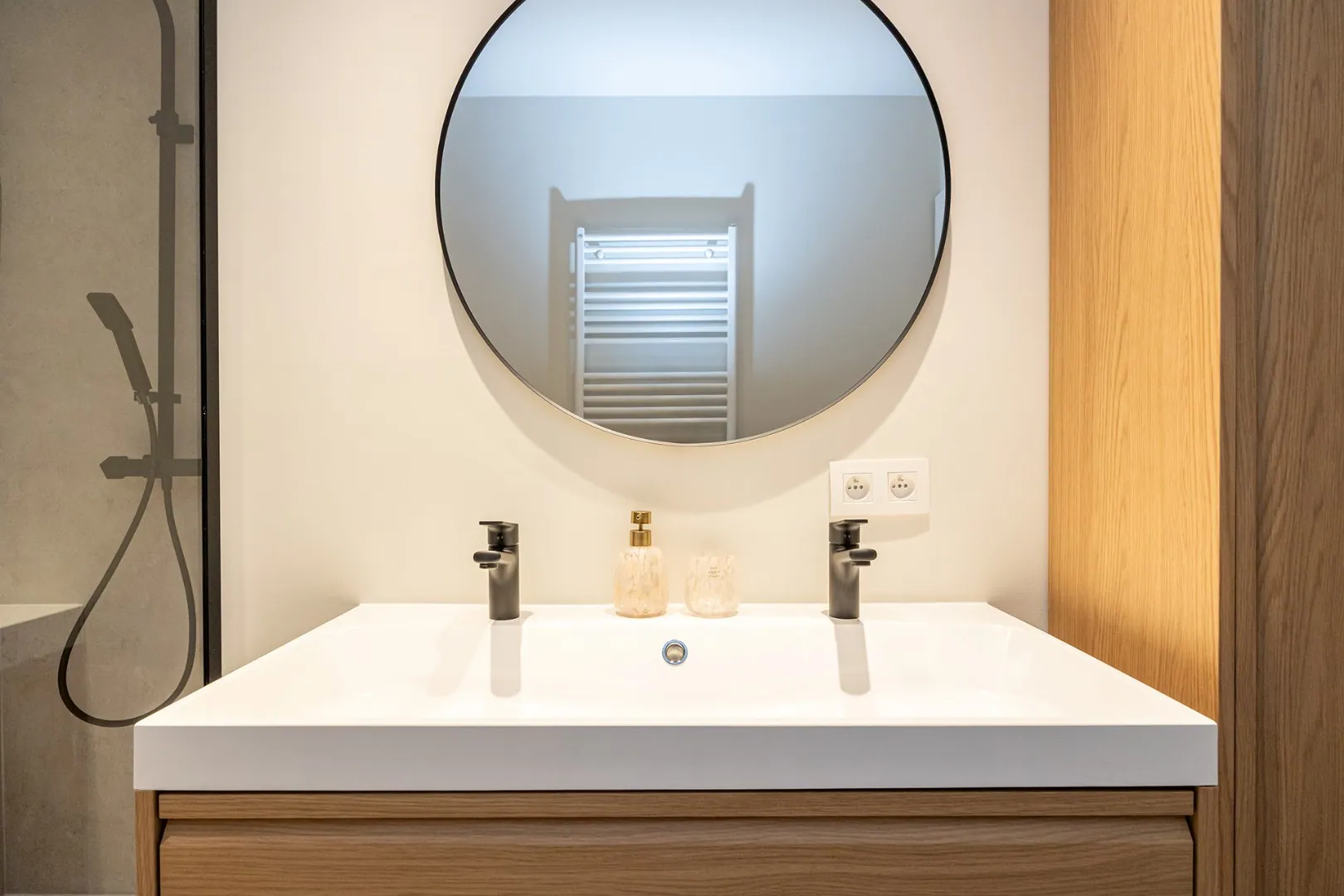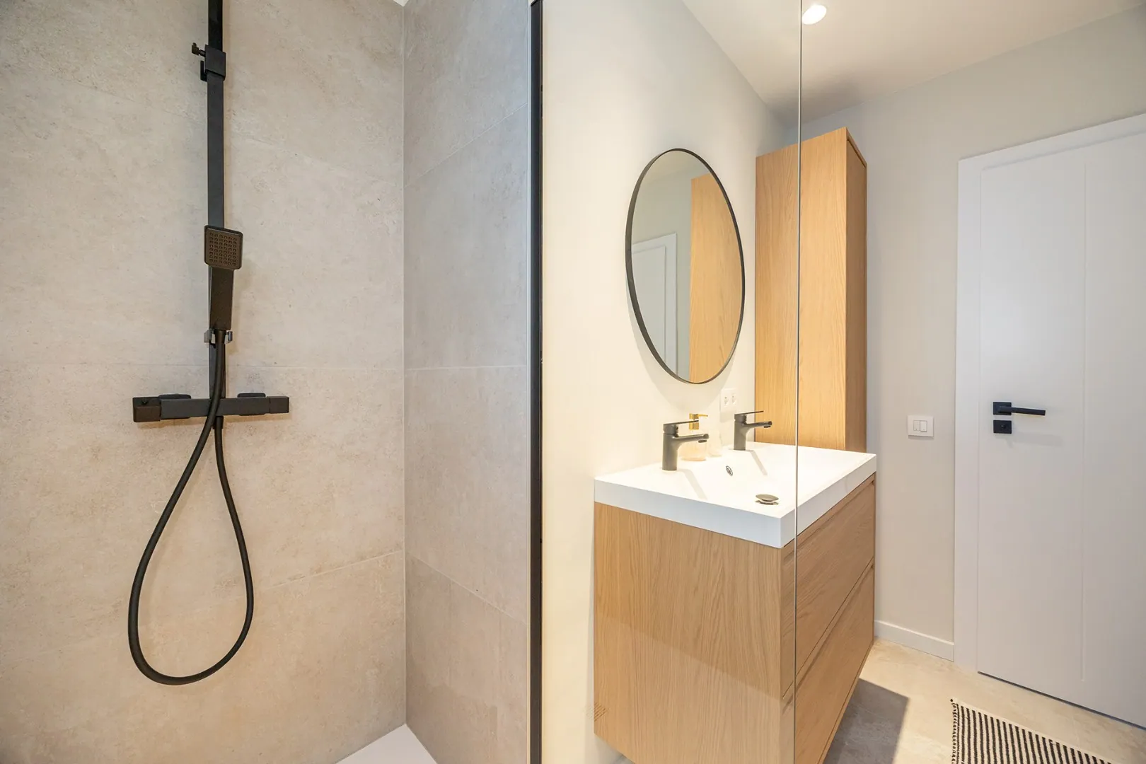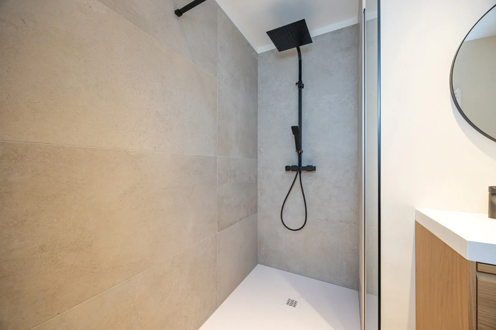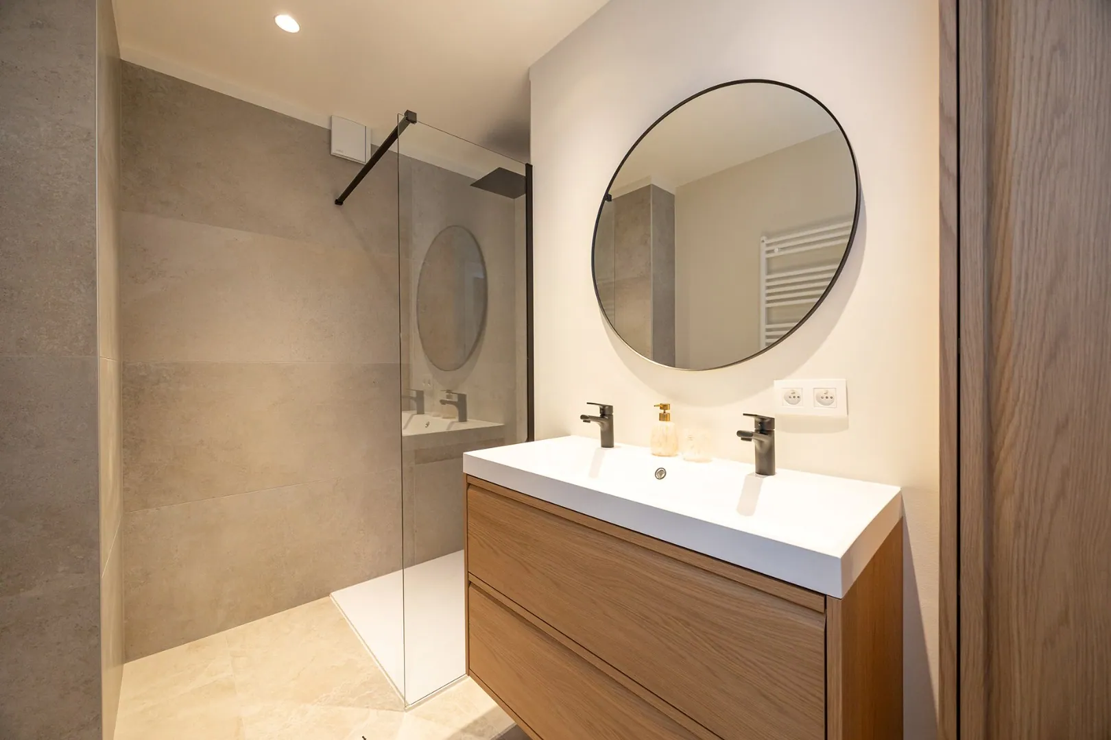 Een badkamer voorzien van moderne inloopdouche met regendouchekop en een dubbele lavabo en een ruime berging/tussenkamer (5m2) momenteel ... ingericht als bureauruimte.
