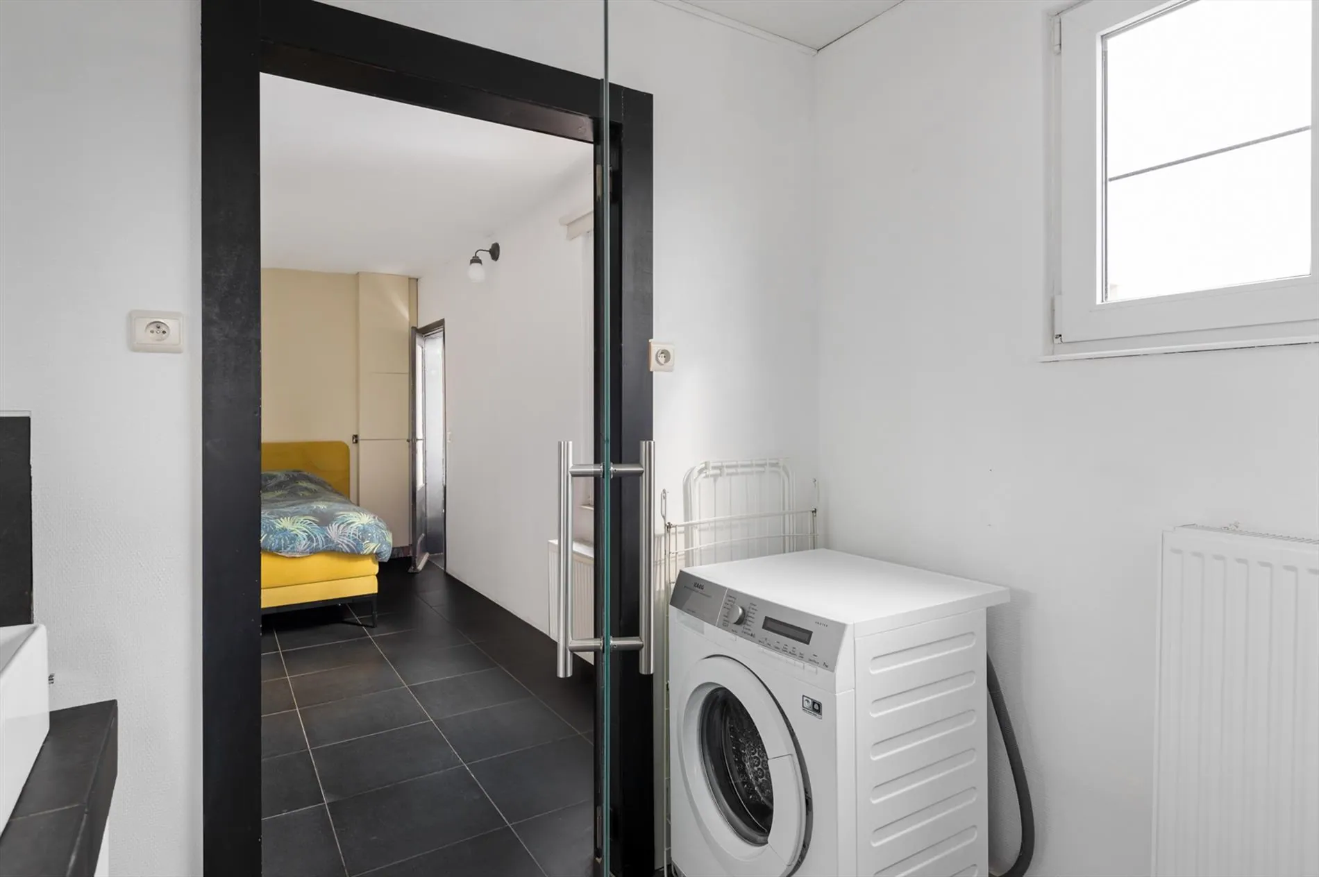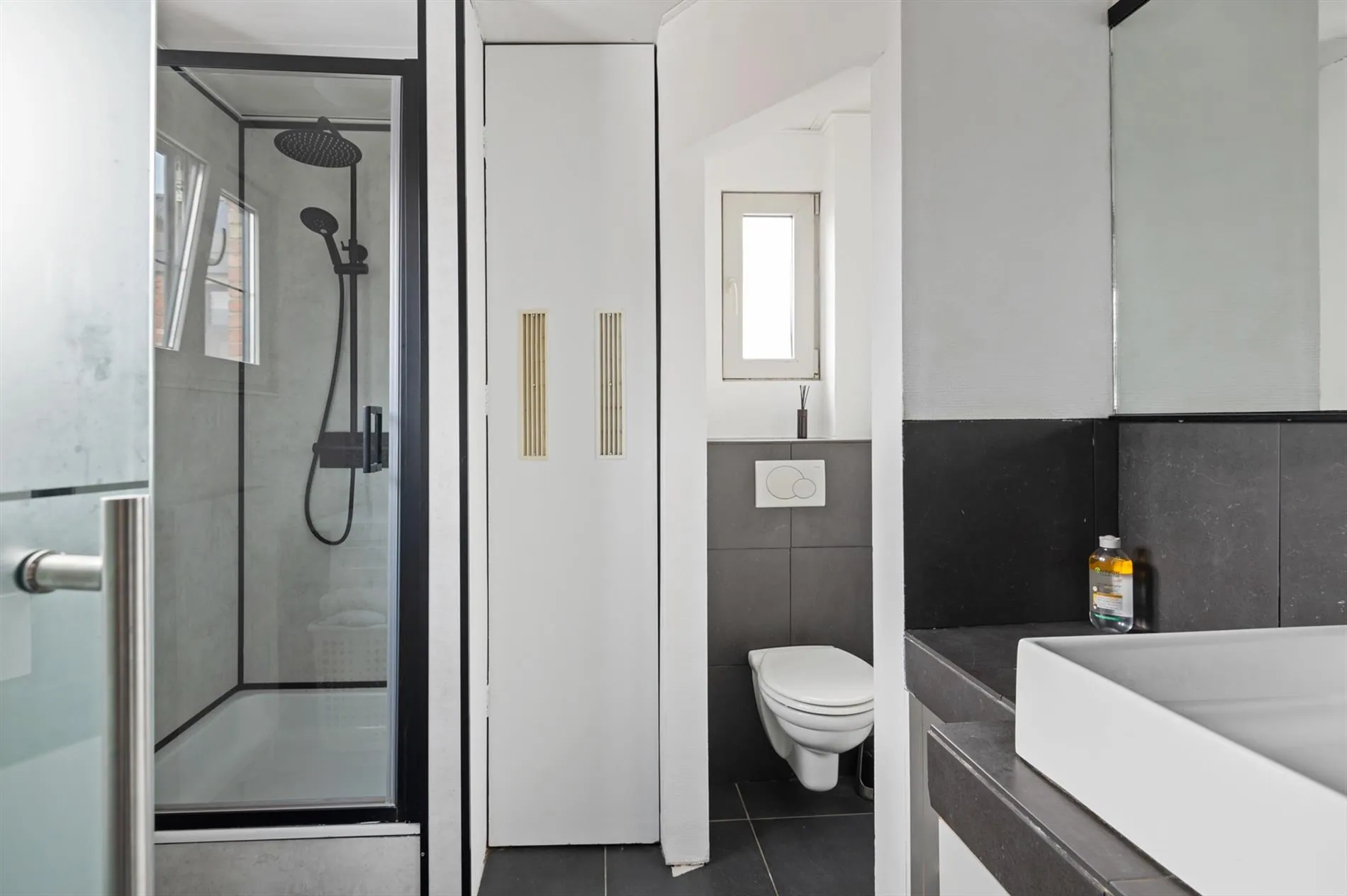 De badkamer is voorzien van een douche met regendouchekop, een lavabo, een toilet en aansluitingen voor droogkast en wasmachine.