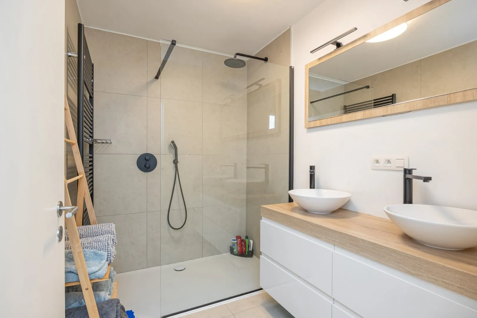 Op de souterrainverdieping bevindt zich een tweede ruime slaapkamer (15m2) voorzien van inbouwkasten en een vernieuwde badkamer voorzien van een ruime moderne inloopdouche met regendouchekop en een dubbele lavabo.