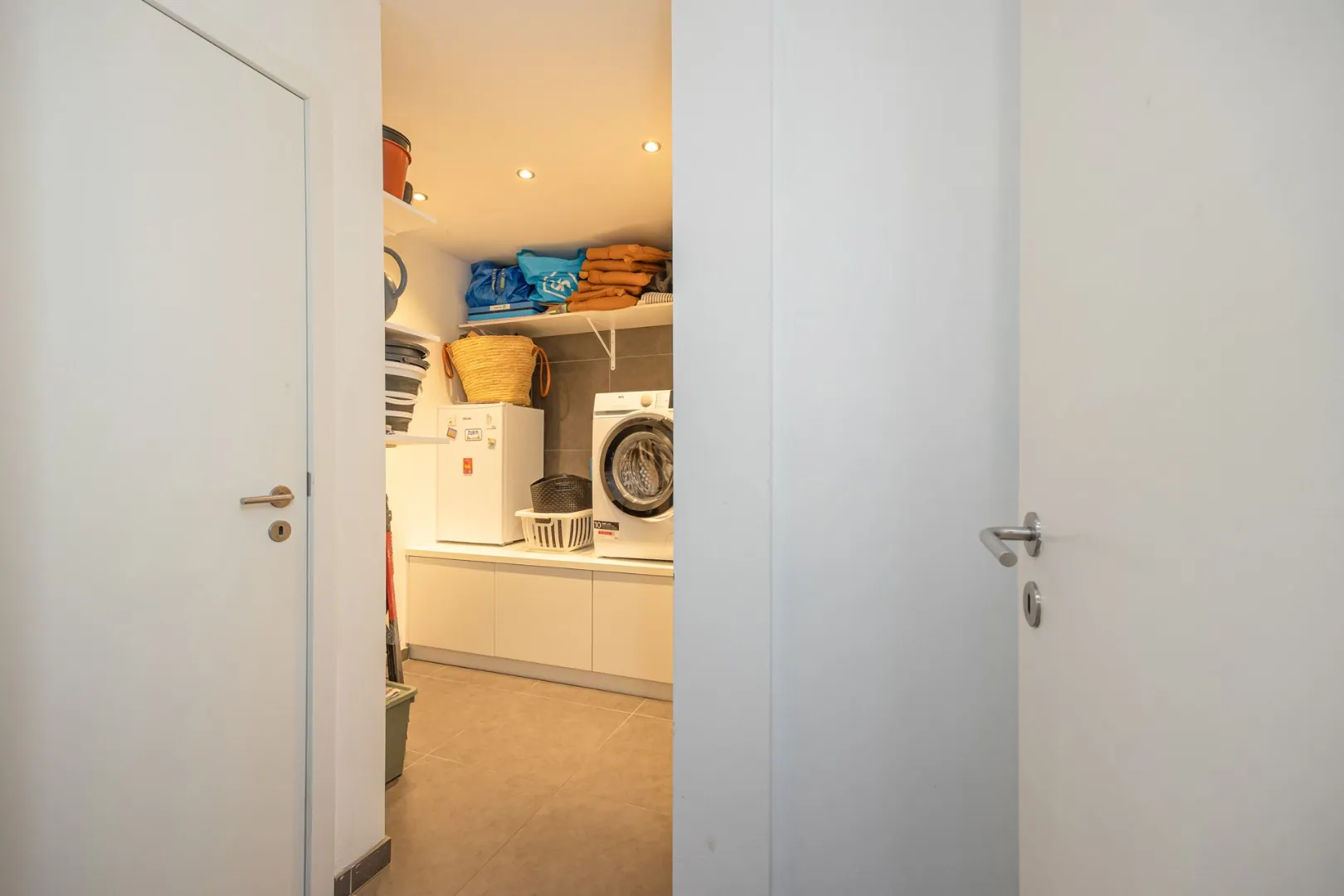 Via de trap bereikt men de gelijkvloerse verdieping ingedeeld in een lichtrijke leefruimte op parketvloeren, een eerste ruime slaapkamer (10m2) voorzien van inbouwkasten, een ruime berging met aansluitingen voor wasmachine en droogkast en een apart toilet.