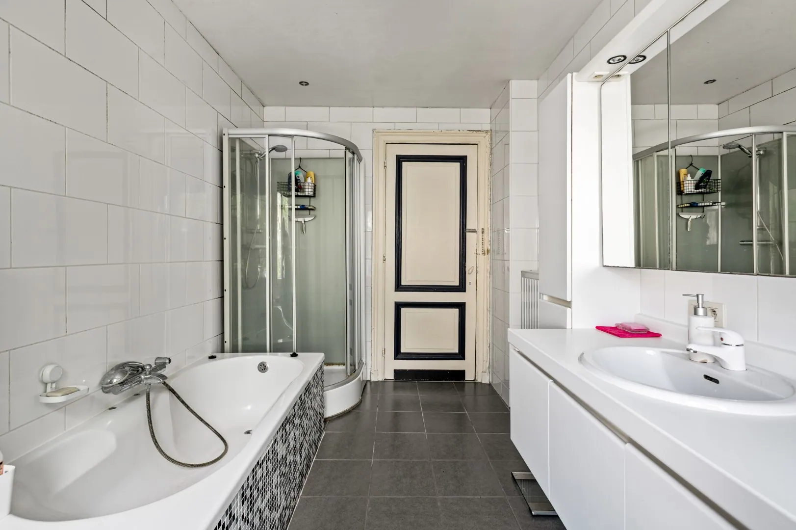 De badkamer op de tussenverdieping is voorzien van een ligbad met douchefunctie, een douche, een lavabo en een toilet.