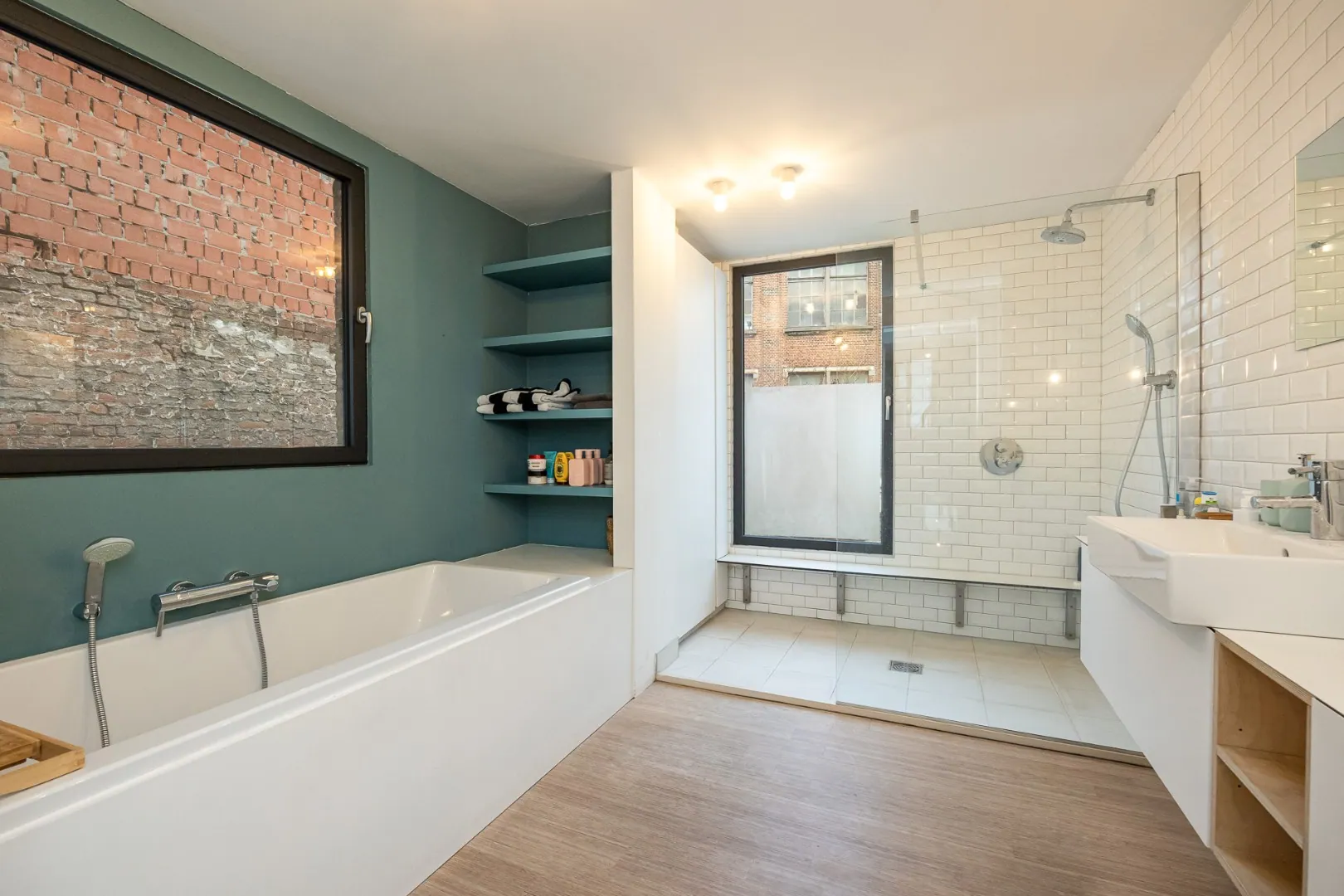 De eerste verdieping is ingedeeld in een eerste ruime slaapkamer (28m2) en een ruime badkamer voorzien van een ligbad, een moderne inloopdouche met regendouchekop en een lavabo. Op de nachthal een apart toilet.