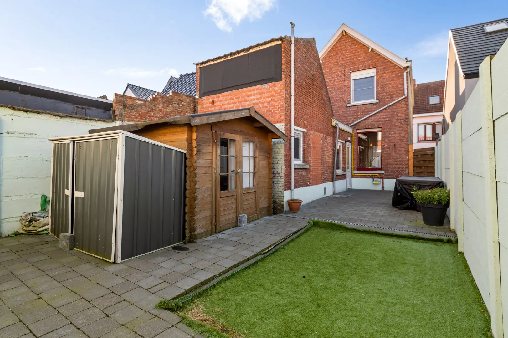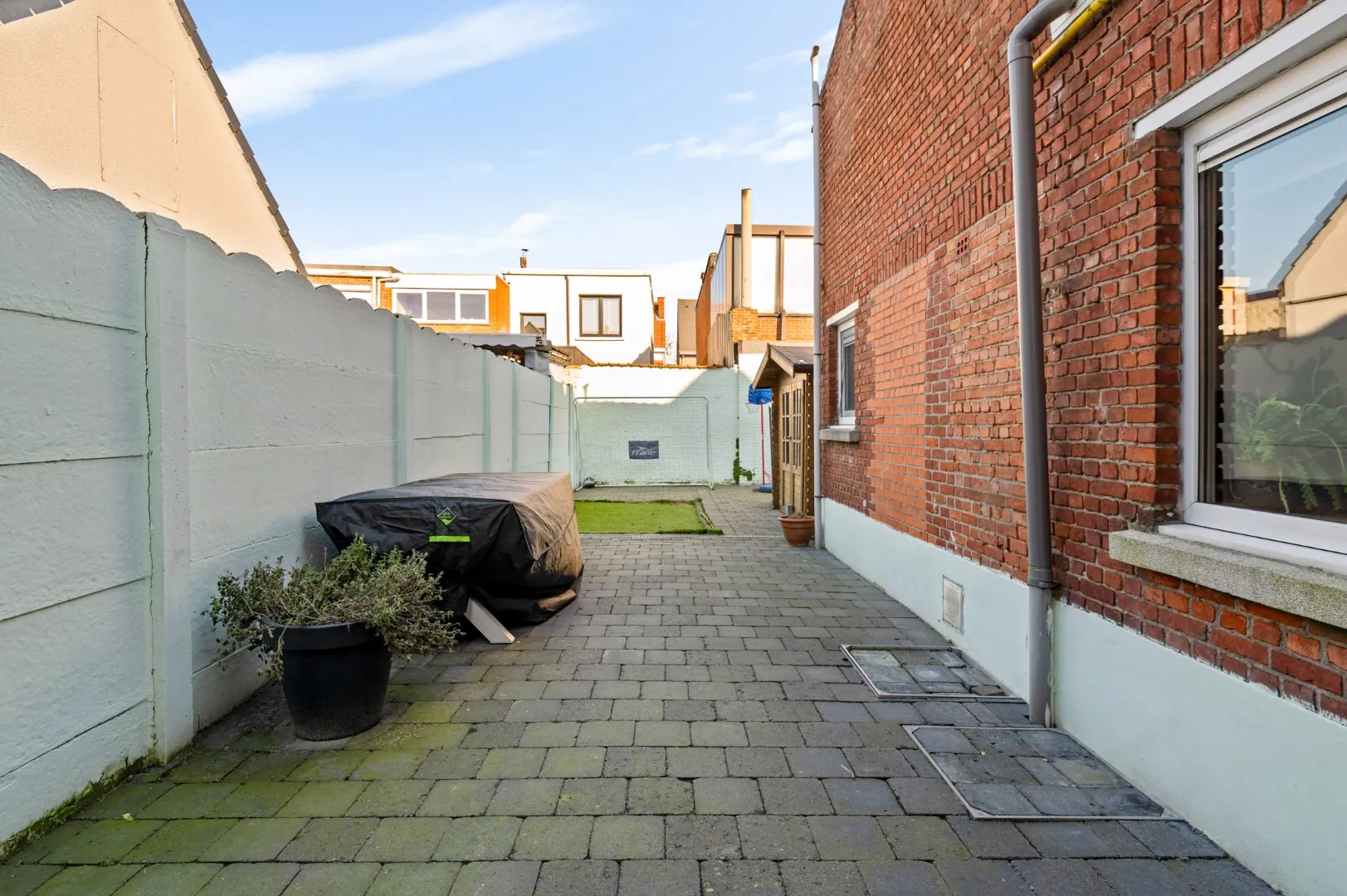 Ten slotte bevindt zich aan de achterzijde de gezellige tuin met terras van in totaal ca. 60m2 ook bereikbaar via de zij-ingang .