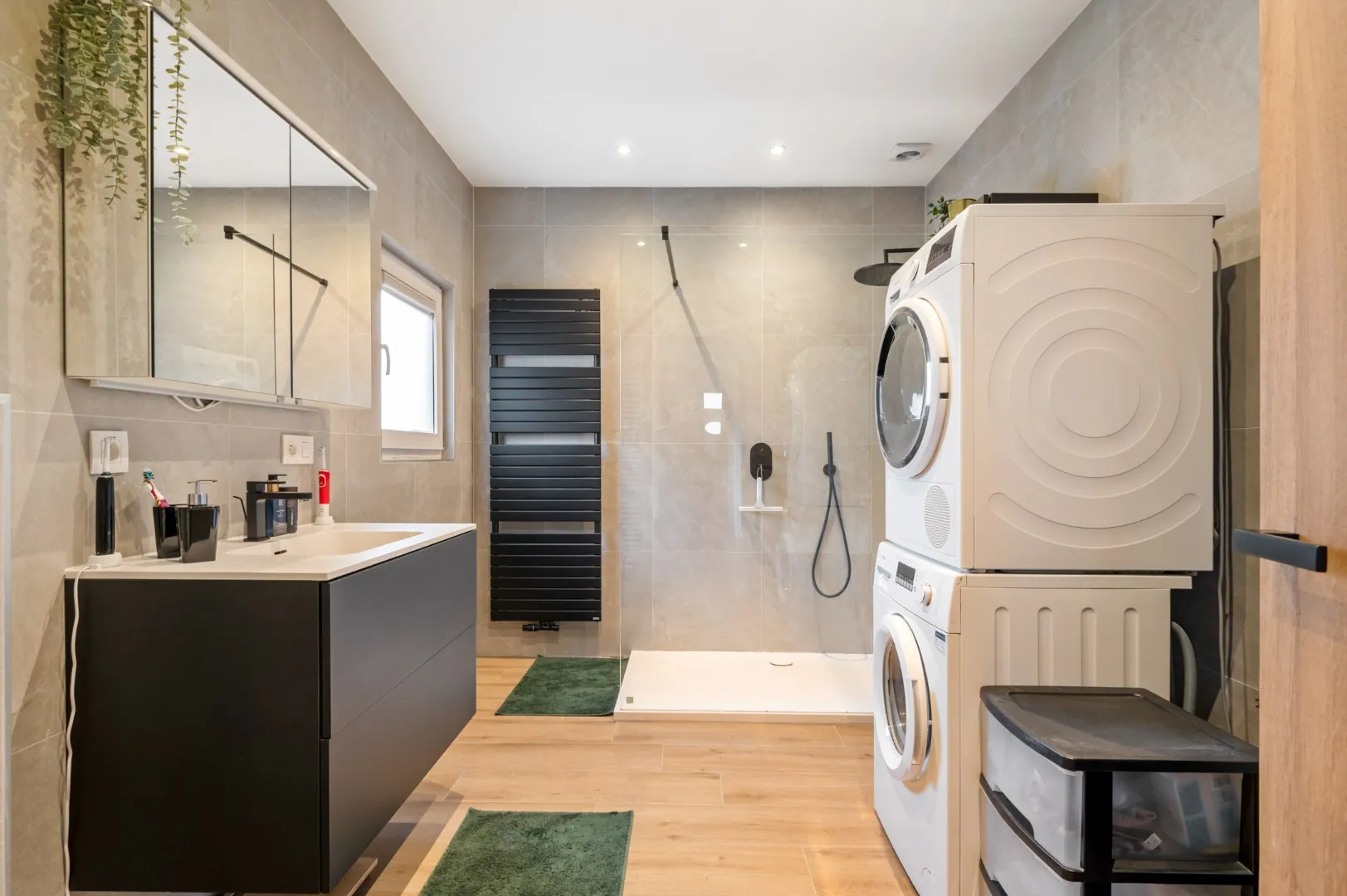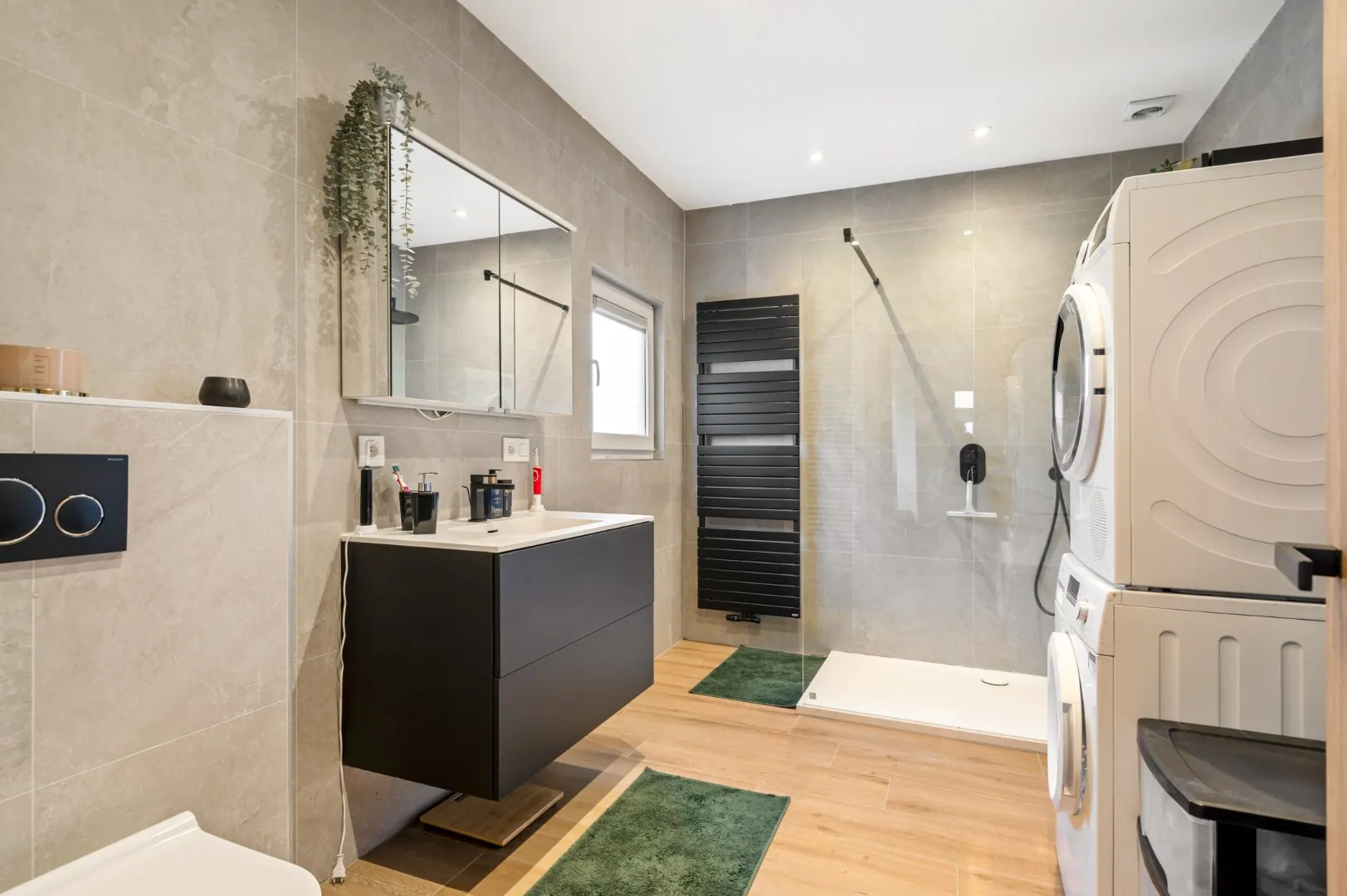 De ruime vernieuwde badkamer is voorzien van een moderne inloopdouche met regendouchekop, lavabo, toilet en aansluitingen voor wasmachine en droogkast.
