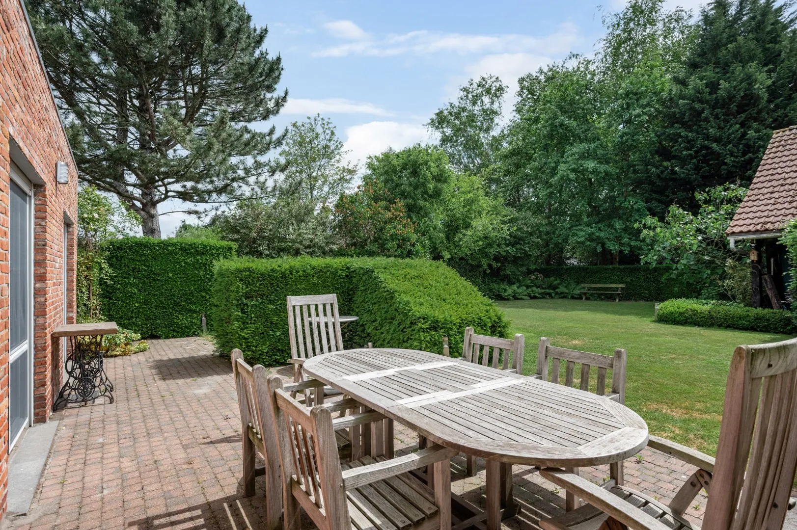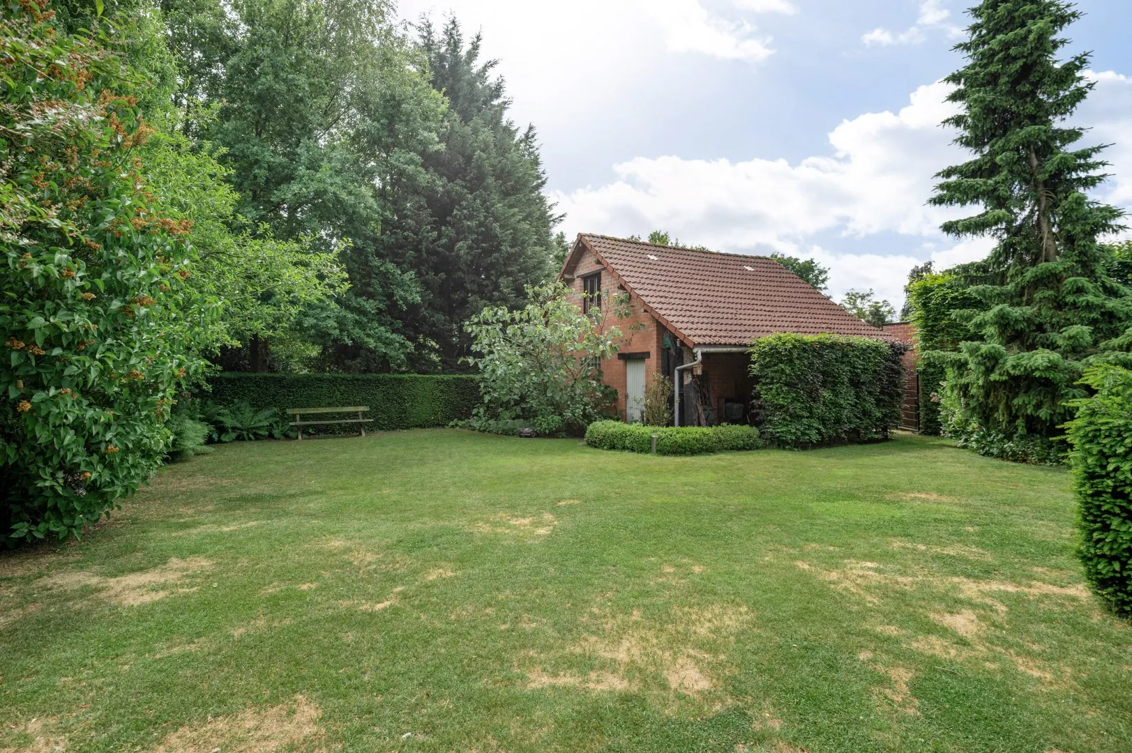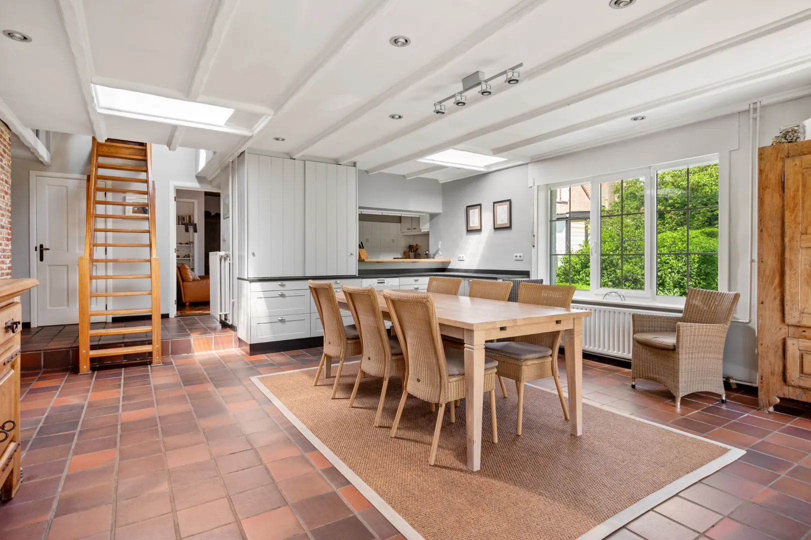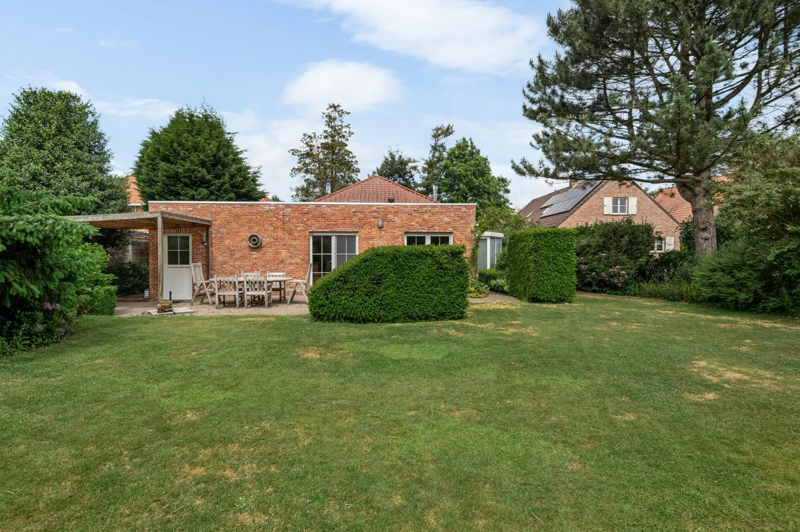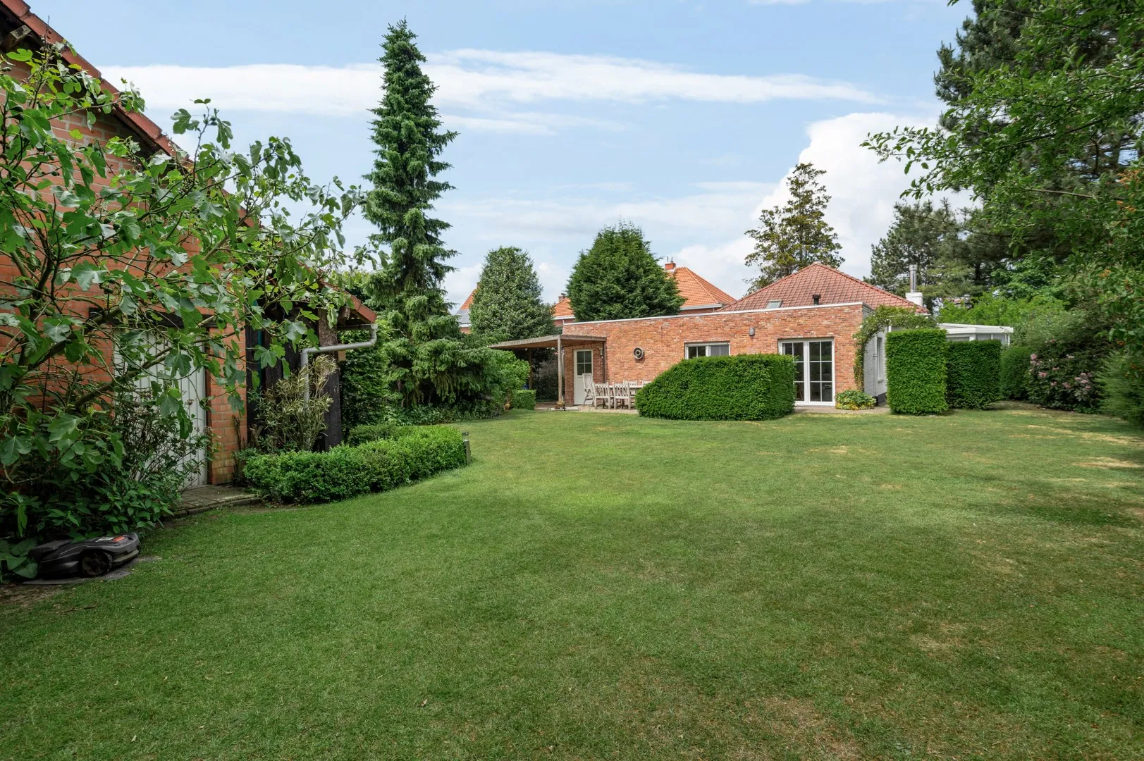De leefkeuken geeft toegang tot de gezellige aangelegde zuidoost-gerichte tuin met terras van ca. 500 m2. Verder bevinden zich op de gelijkvloerse verdieping nog drie slaapkamers (13m2 - 12m2 - 12m2) en een badkamer voorzien van een ligbad, een douche, een dubbele lavabo en een tweede toilet.