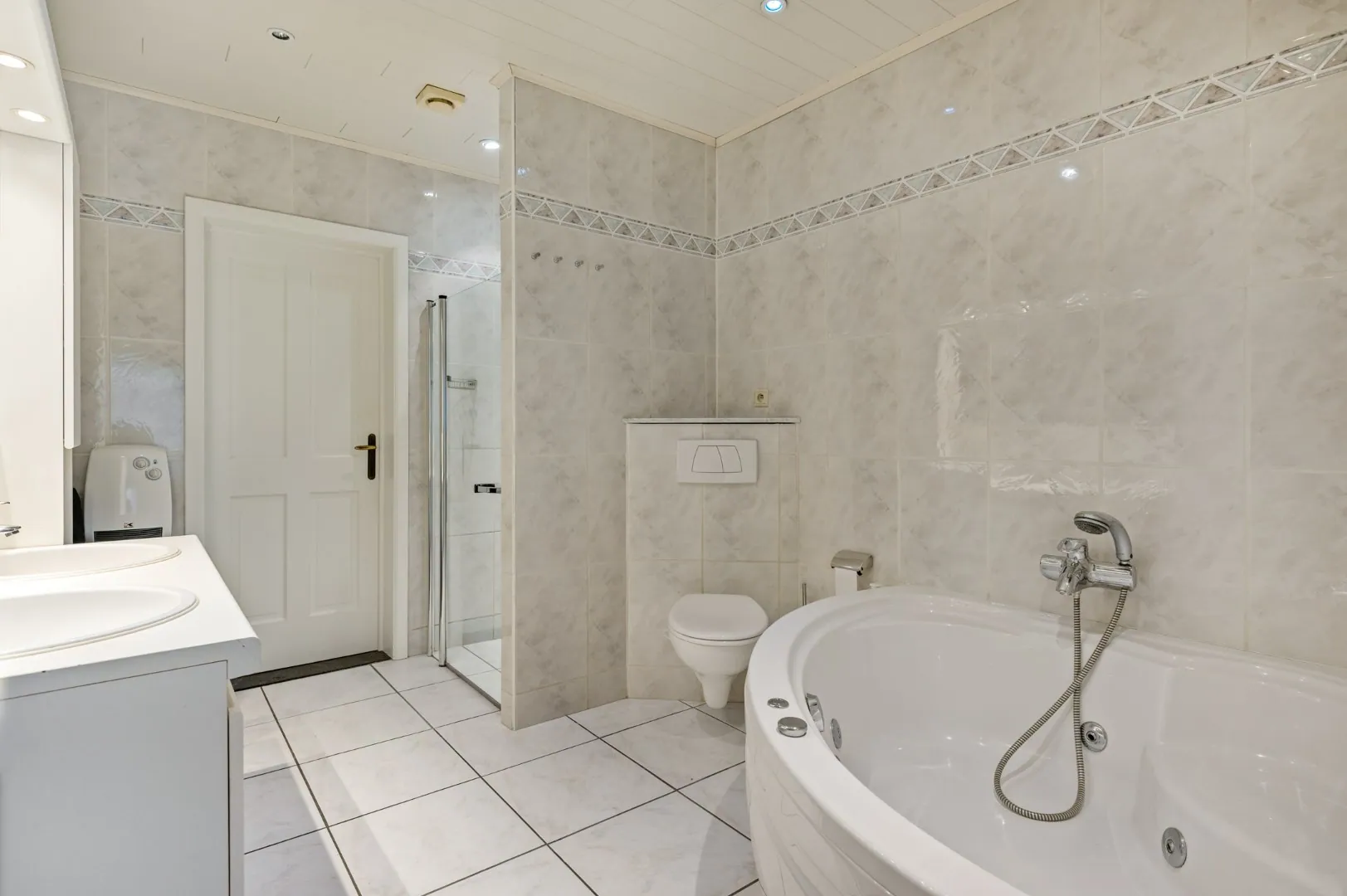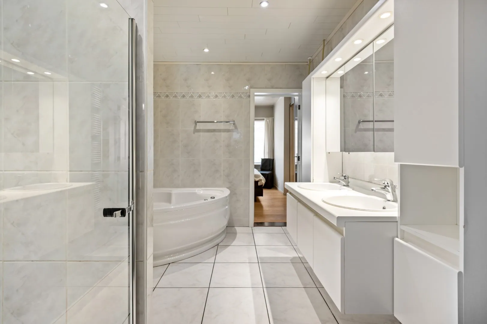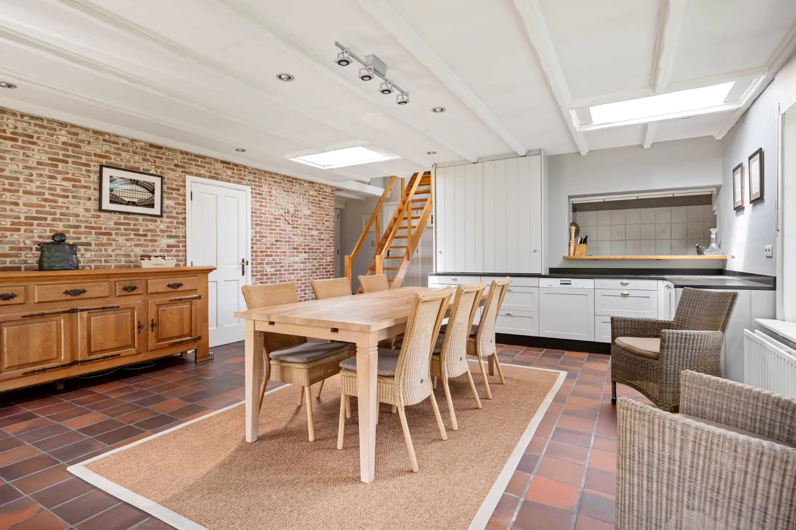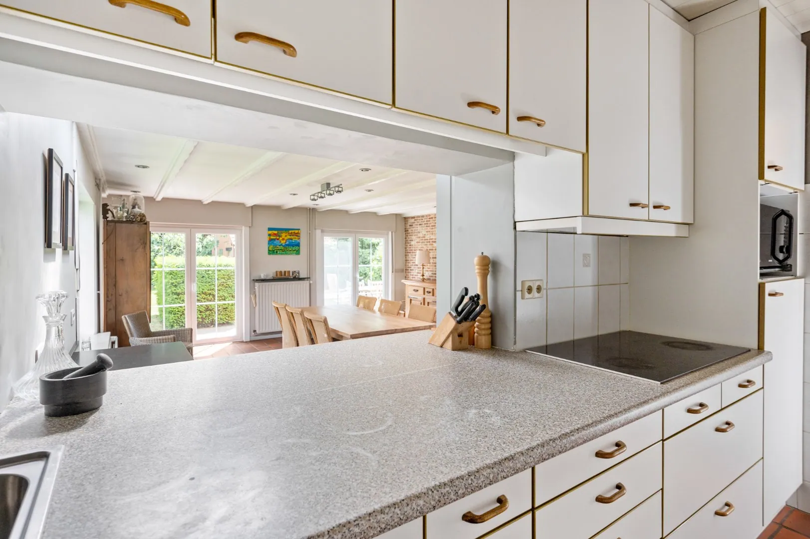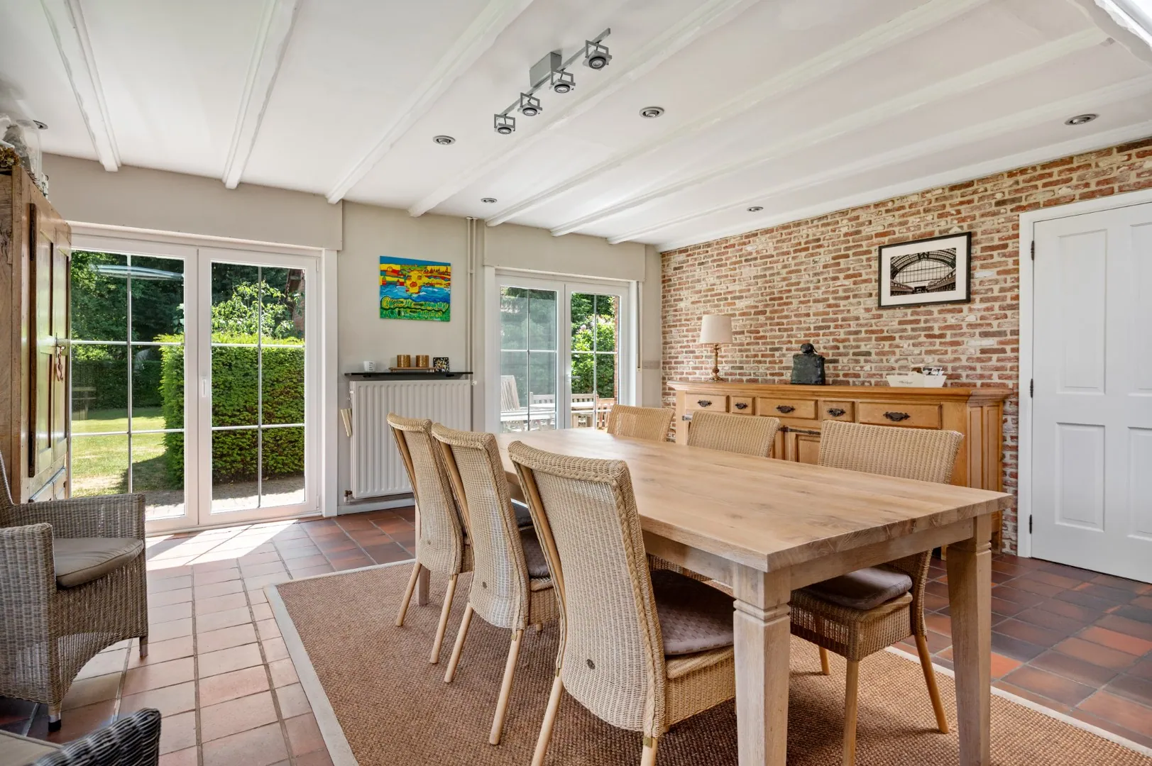 De leefkeuken geeft toegang tot de gezellige aangelegde zuidoost-gerichte tuin met terras van ca. 500 m2. Verder bevinden zich op de gelijkvloerse verdieping nog drie slaapkamers (13m2 - 12m2 - 12m2) en een badkamer voorzien van een ligbad, een douche, een dubbele lavabo en een tweede toilet.