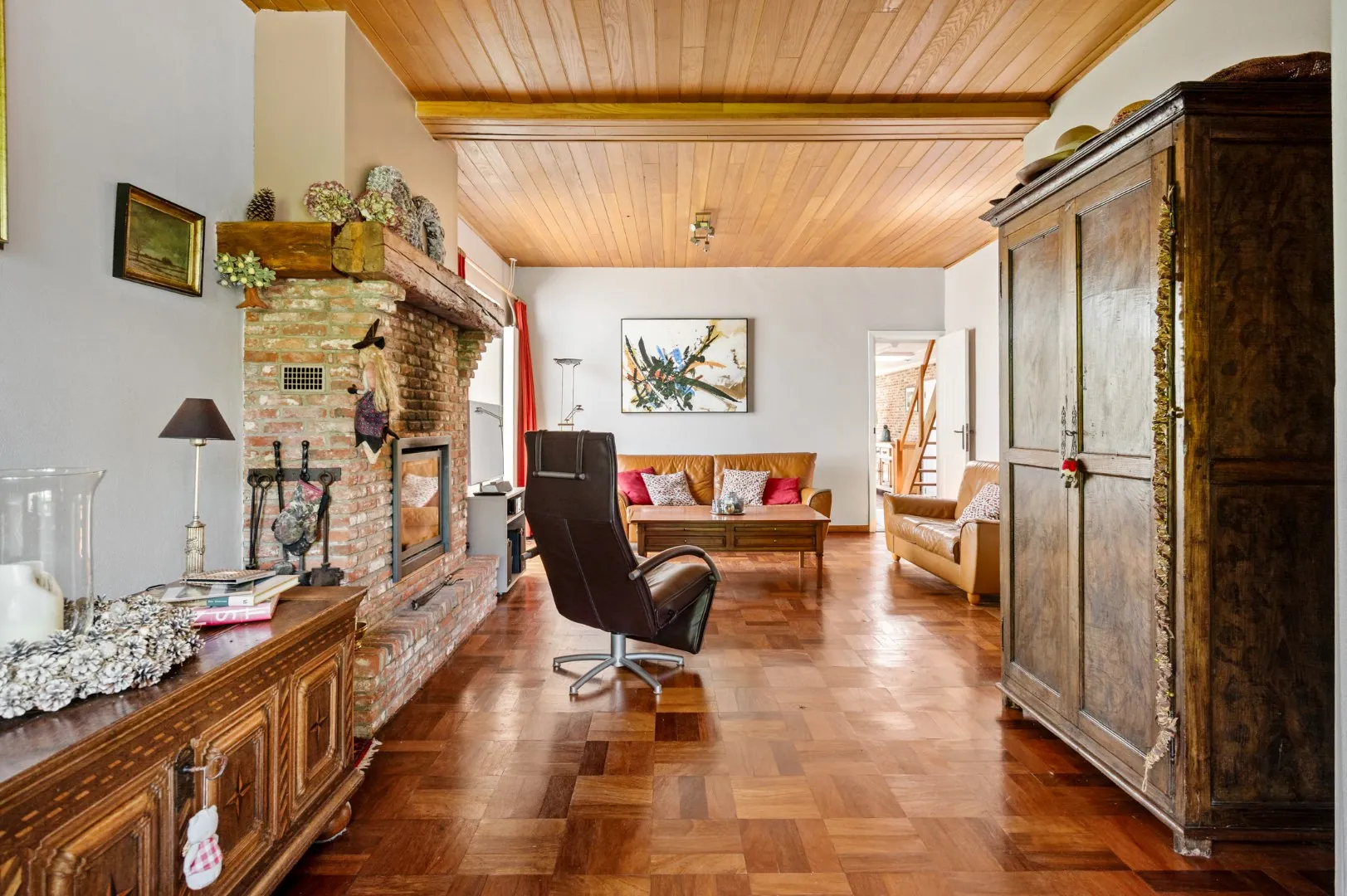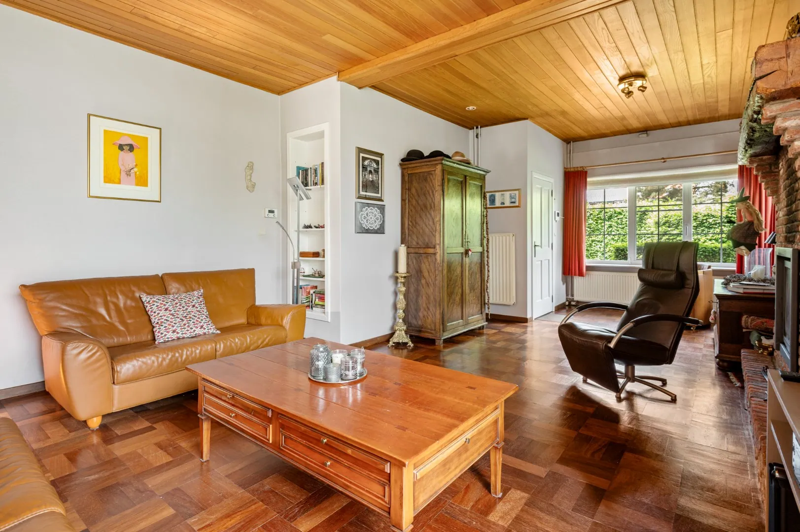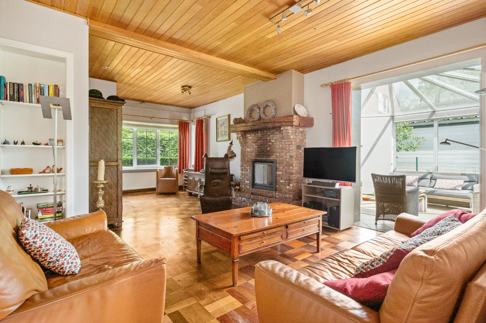 De woning is als volgt ingedeeld: via de inkomhal betreedt men de woning, deze geeft toegang tot de lichtrijke leefruimte op originele parket vloeren met houtkachel, aangrenzend de verwarmde veranda (ca. 14m2), de leefkeuken met de eetkamer voorzien van toestellen, een apart toilet en een berging voorzien van aansluitingen voor wasmachine en droogkast.