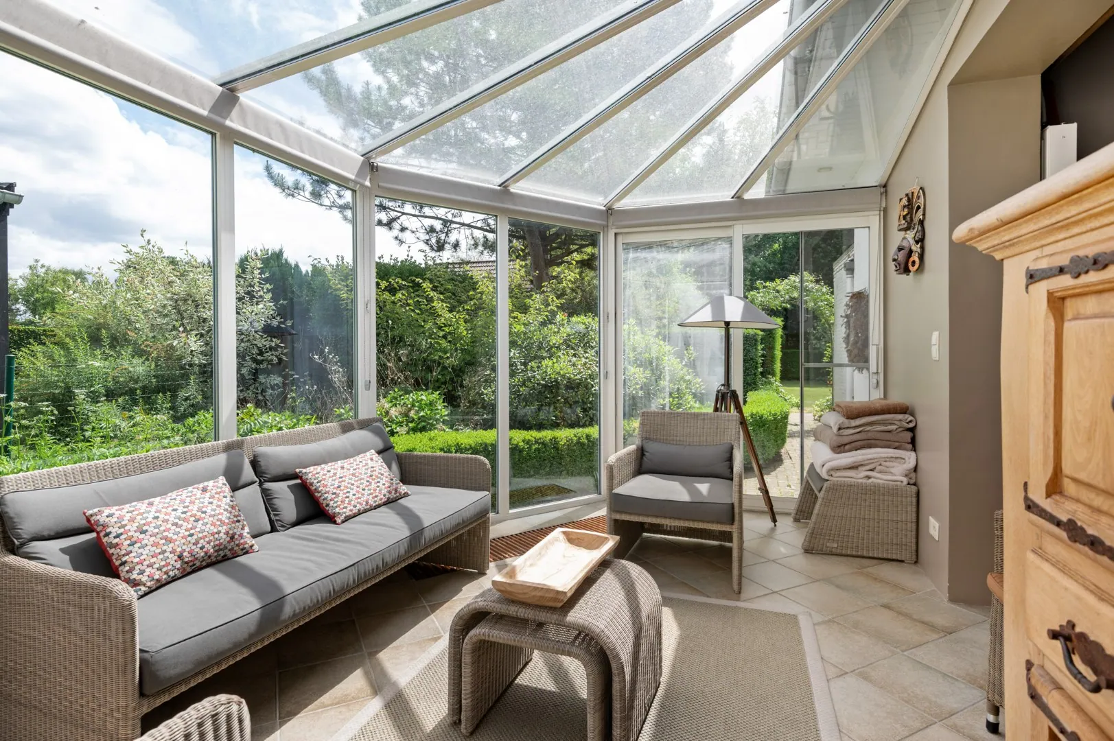 Ten slotte bevindt zich aan de ... voorzijde een eerste garage met een aparte carport. Een tweede en derde zeer ruime garage bevinden zich aan de achterzijde van het perceel en zijn toegankelijk via een servitudeweg en de tuin.