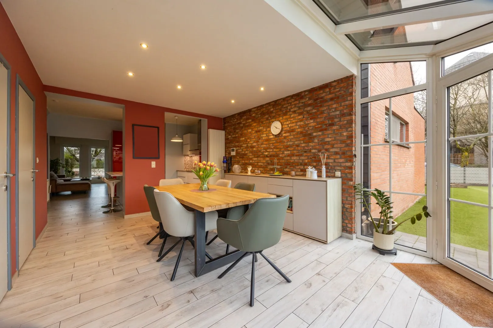 De woning is als volgt ingedeeld: via de lichtrijke veranda betreedt men de woning, deze geeft toegang tot een eetruimte met berging en apart toilet en een open leefkeuken voorzien van toestellen. Grenzend aan de keuken bevindt zich de woonkamer.