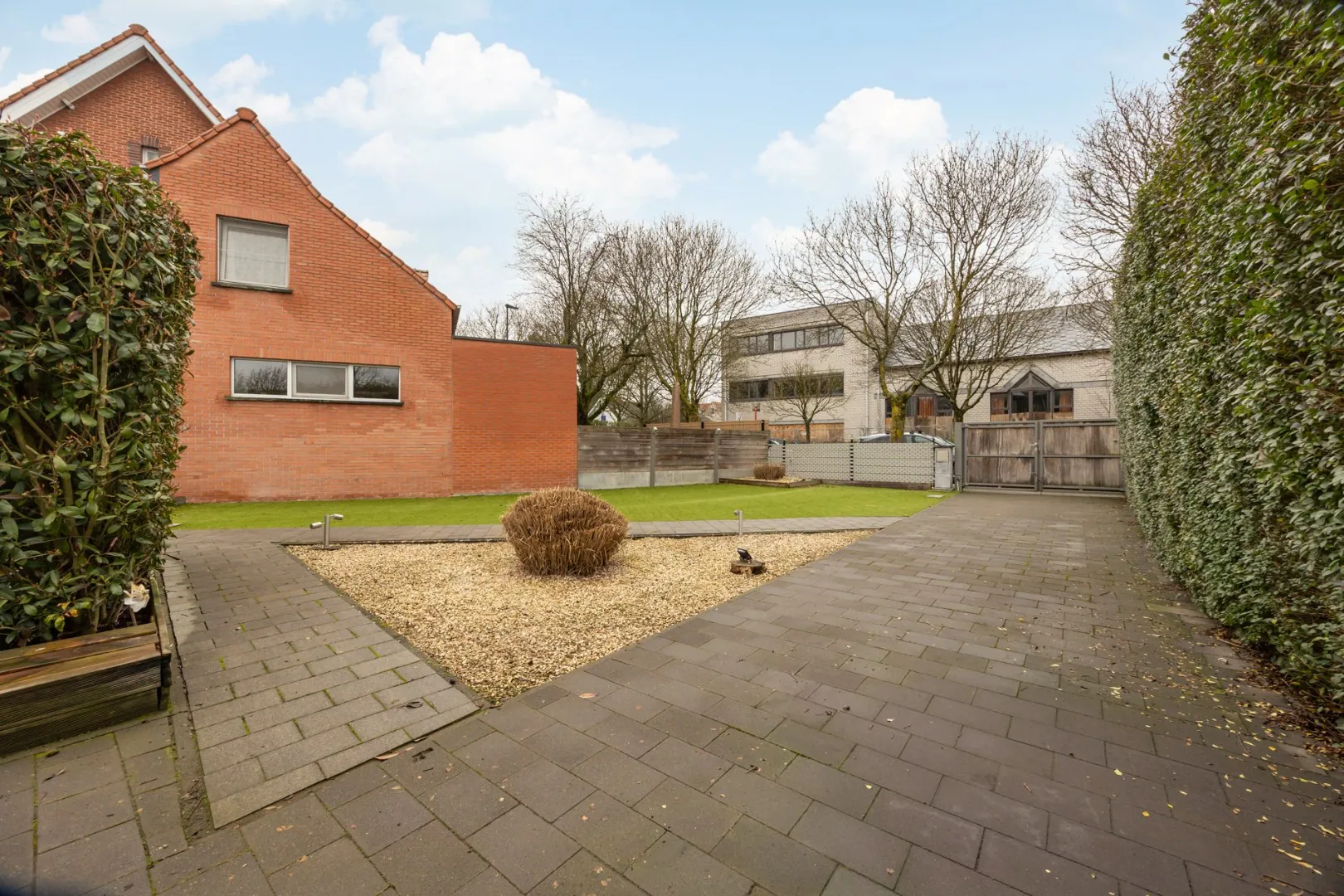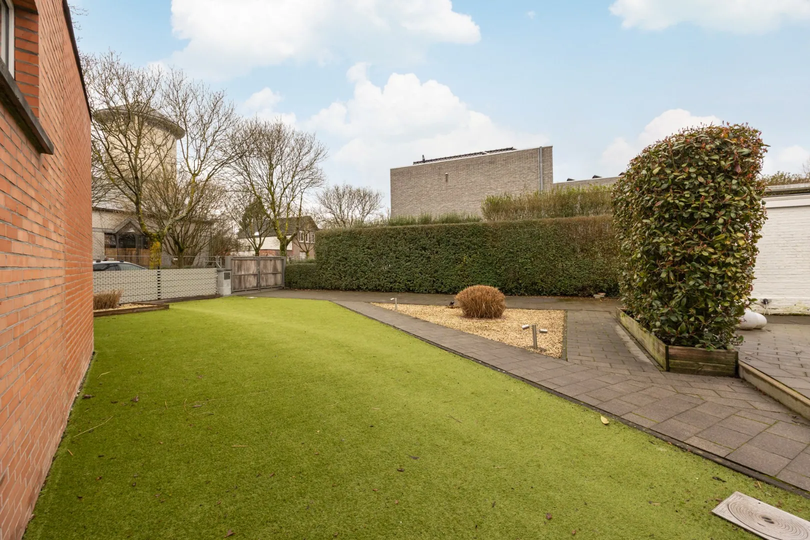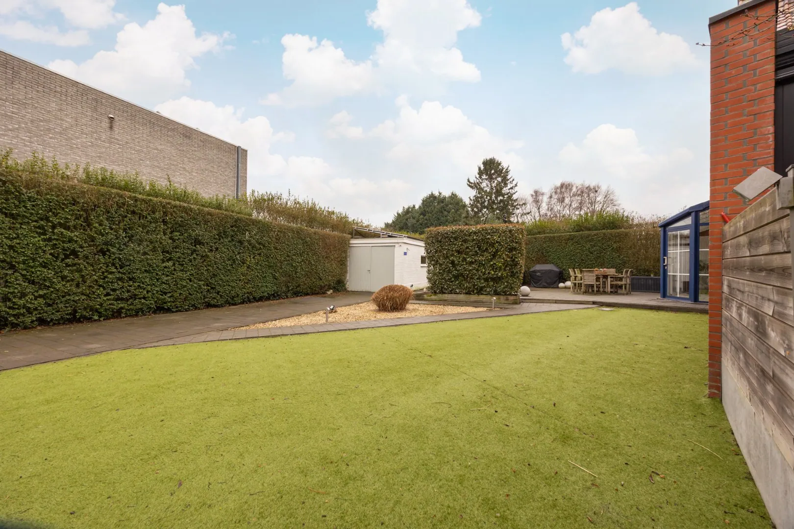 Een volledig afgesloten tuin met aangelegd terras en houten opritpoort van in totaal ca. 220m2.