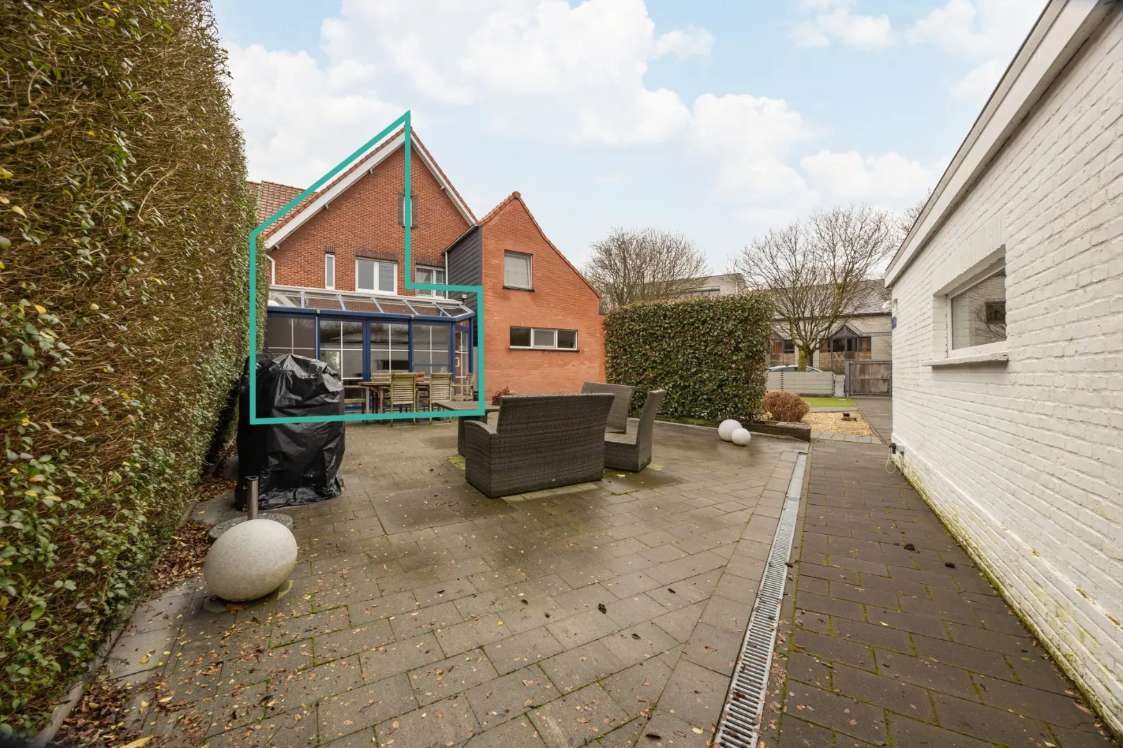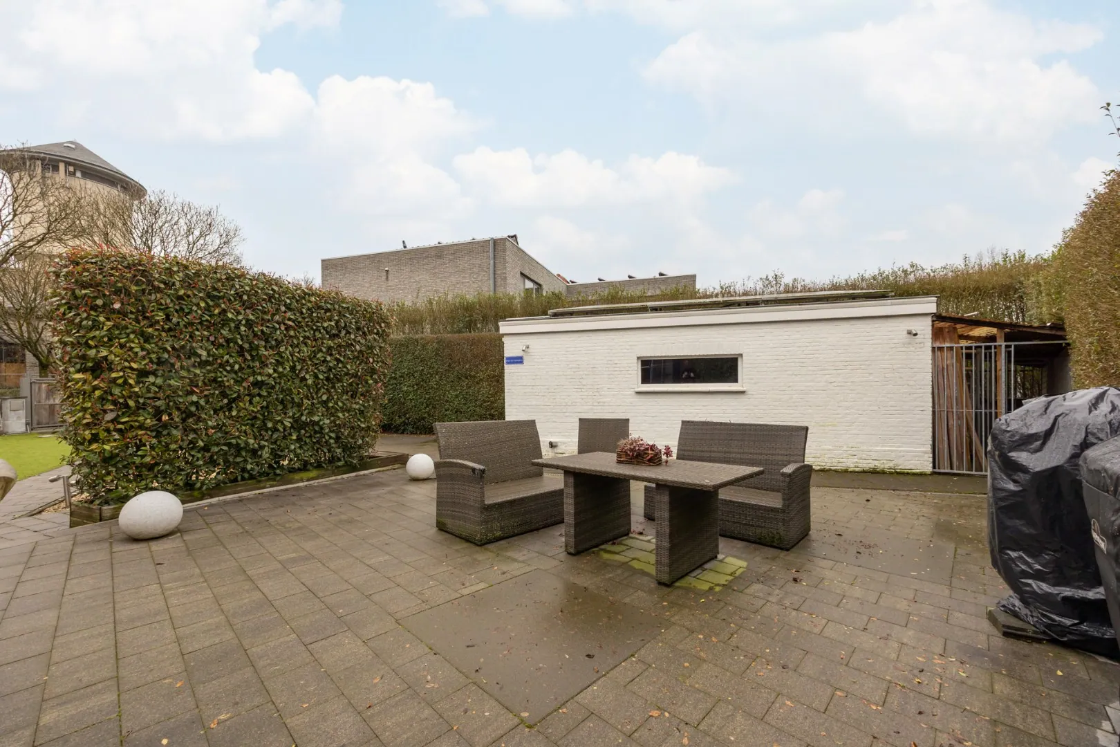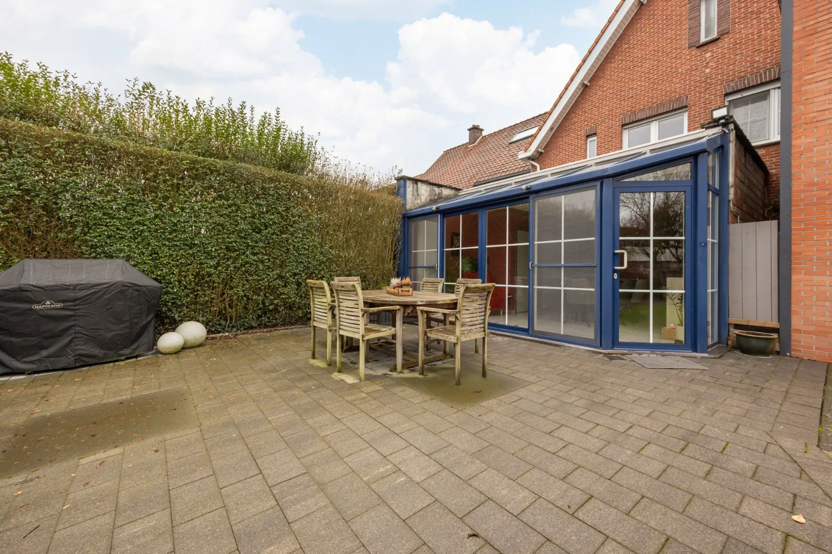 Een volledig afgesloten tuin met aangelegd terras en houten opritpoort van in totaal ca. 220m2.