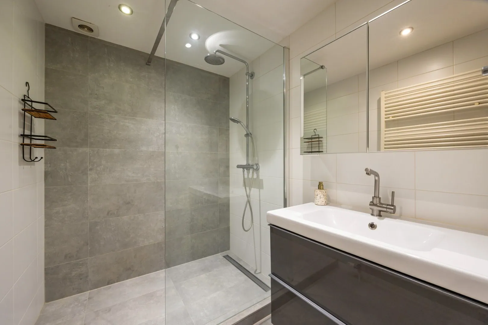 De eerste verdieping is ingedeeld in een eerste slaapkamer (16m2), een vernieuwde badkamer voorzien van een moderne inloopdouche met regendouchekop en een lavabo, een apart toilet en een wasplaats.